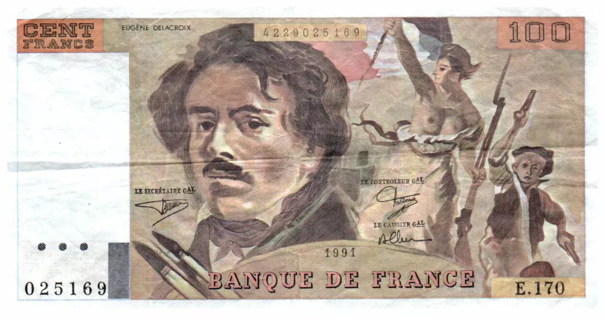 Accueil > Billets Français > Billets Banque de France > Billets 100 Francs > Delacroix type 1978 (1978-1995) > France 100 Francs Delacroix - 1991 Série E.170 - Grand filigrane - TTB