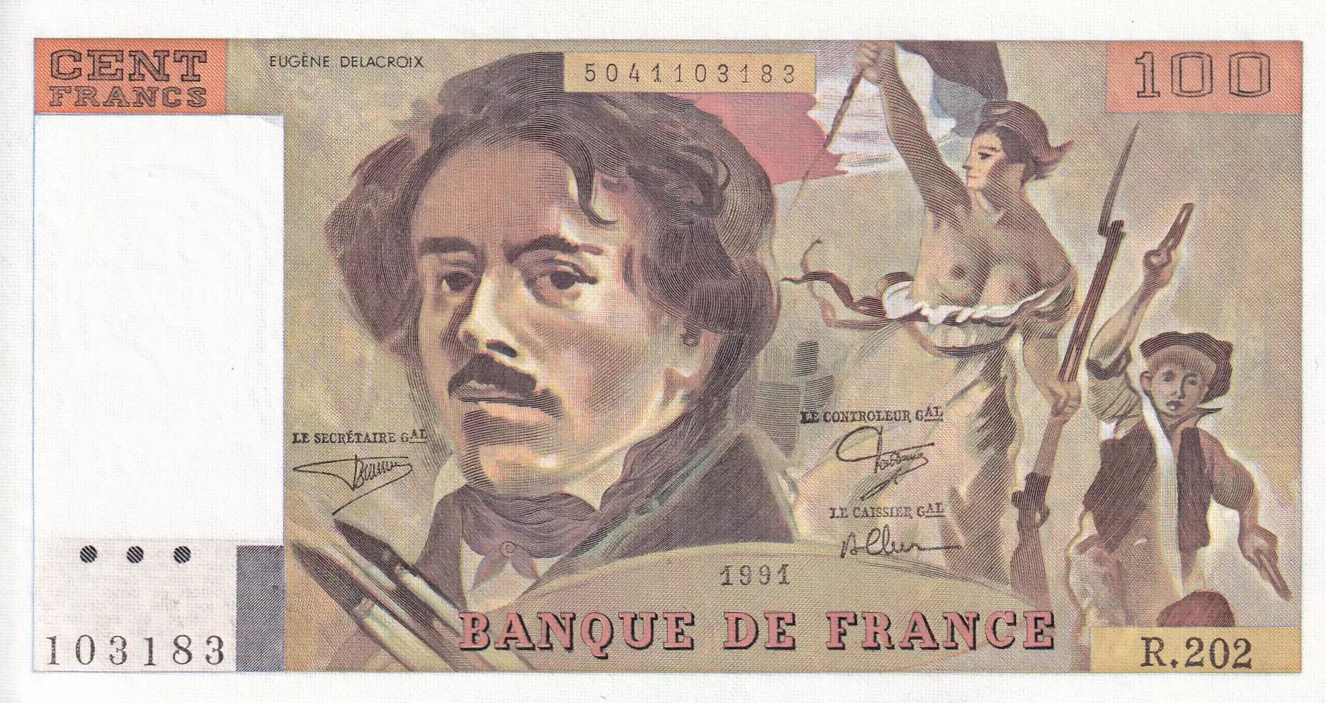 Accueil > Billets Français > Billets Banque de France > Billets 100 Francs > Delacroix type 1978 (1978-1995) > France 100 Francs - Delacroix - 1991 - Série R.202 - F.69BIS.03c1