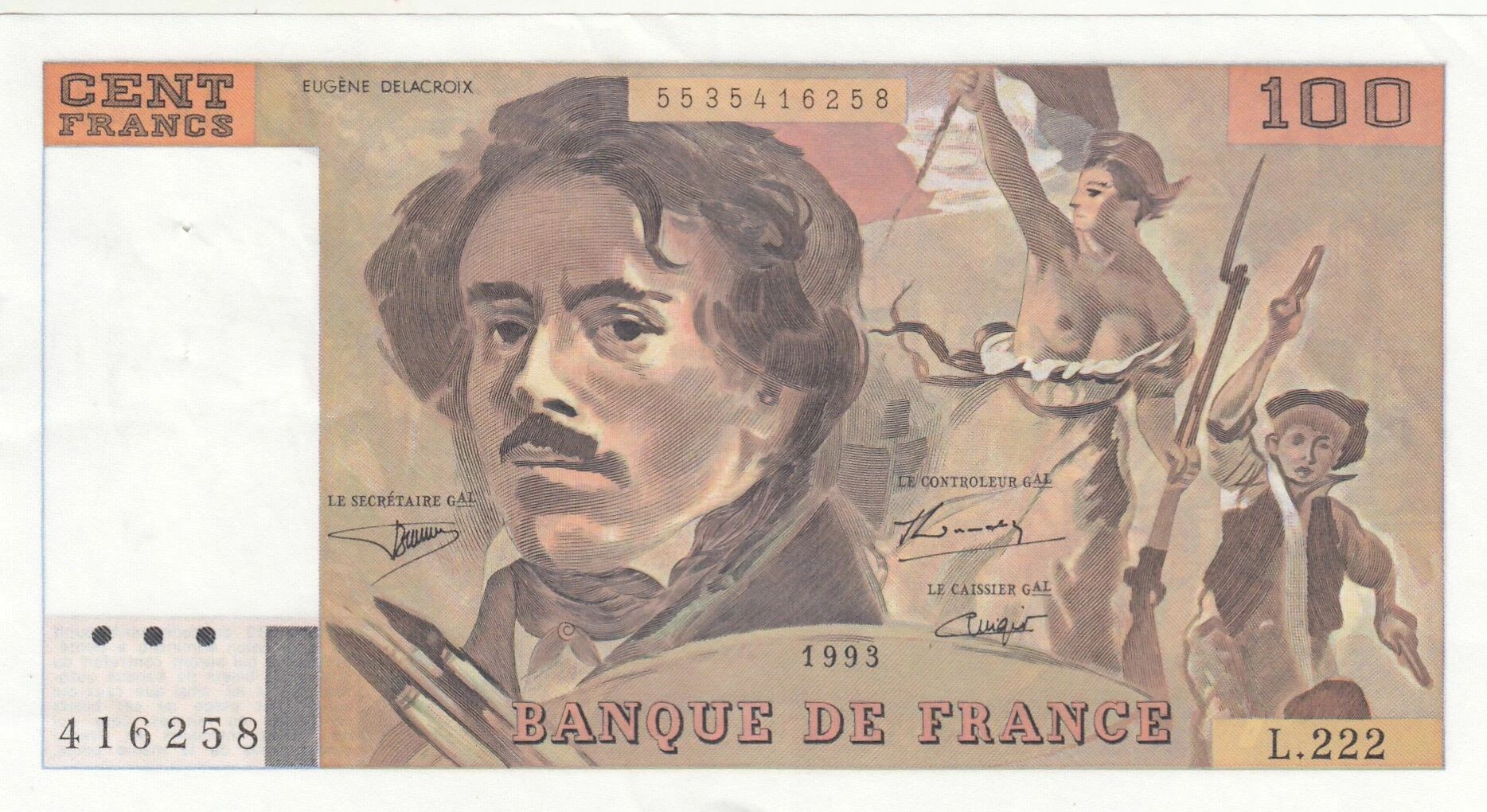 Ce billet de banque de 100 francs français, émis en 1993, fait partie de la série Delacroix. Son code de série est L.222.