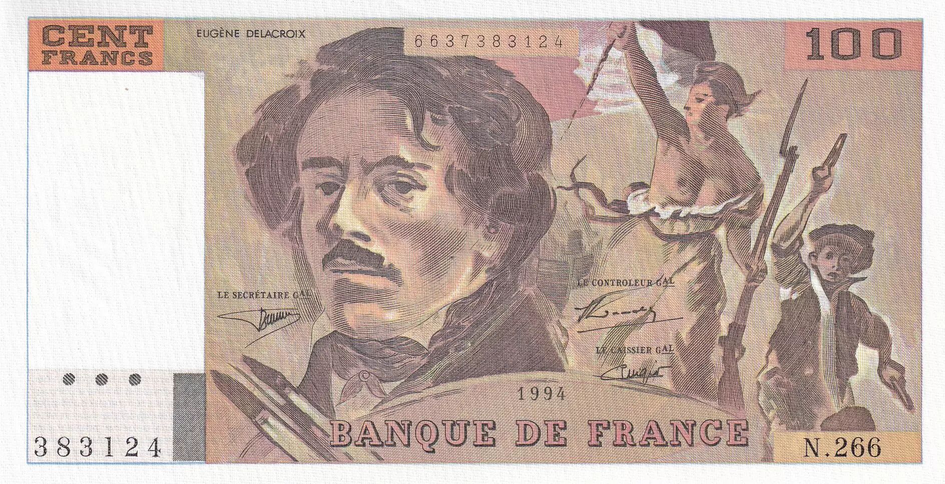 Accueil > Billets Français > Billets Banque de France > Billets 100 Francs > Delacroix type 1978 (1978-1995) > France 100 Francs - Delacroix - 1994 - Série N.266 - F.69ter.01b