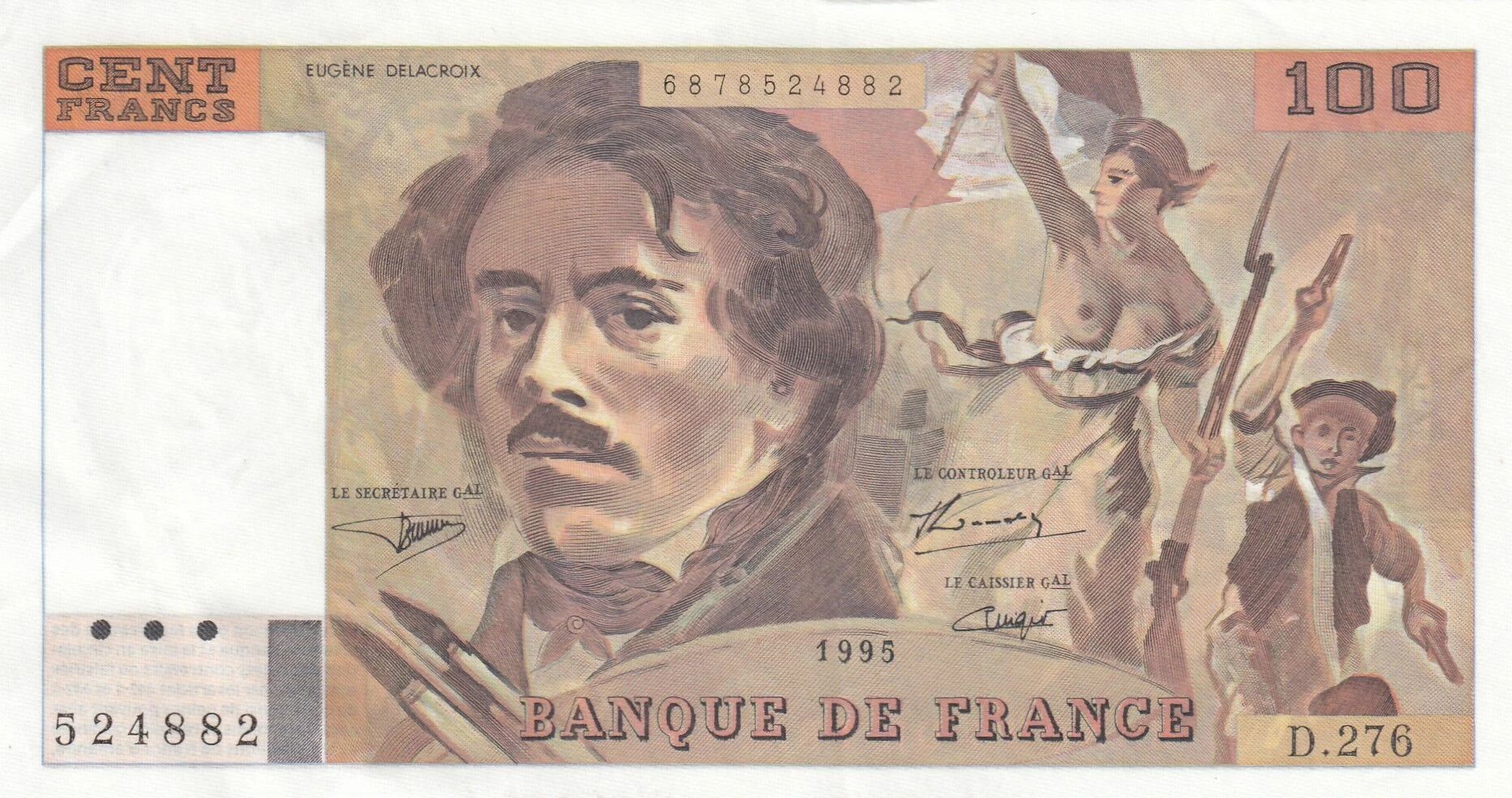 This French banknote has a face value of 100 francs. It was issued in 1995.
