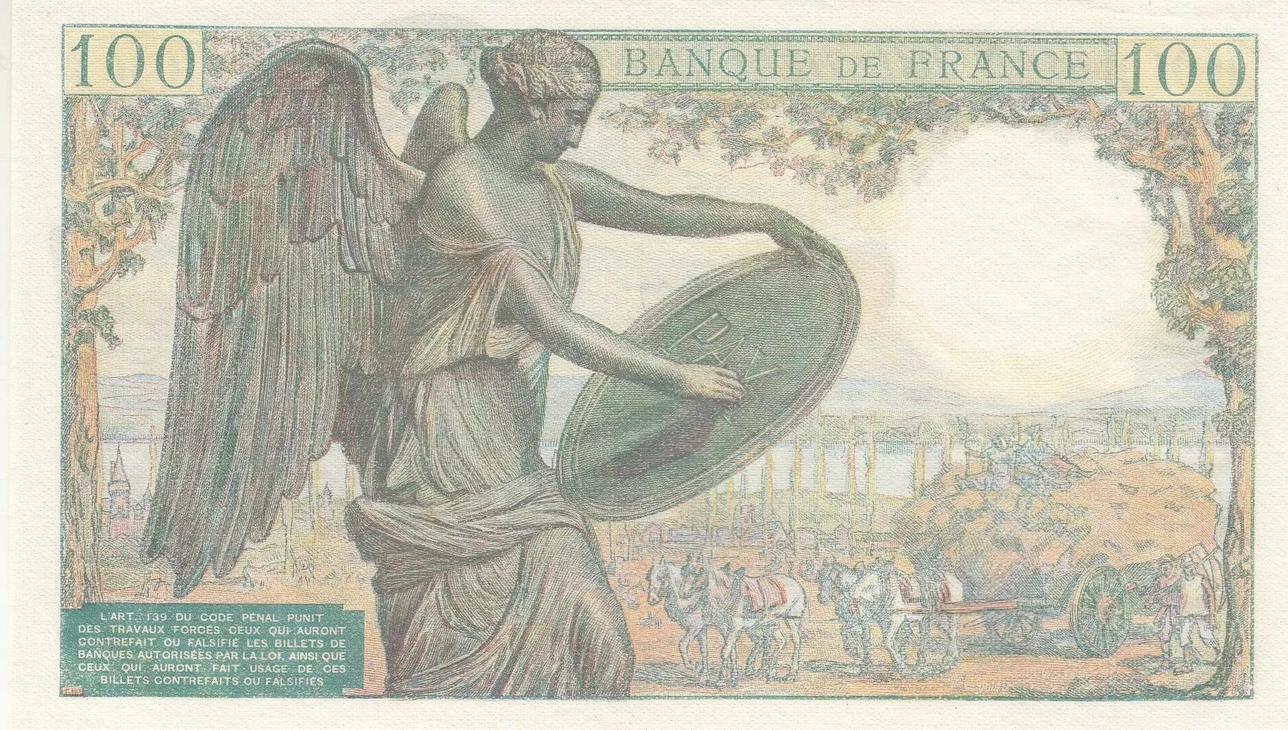 The back of the banknote features a bronze statue of a winged Victory, holding a shield engraved with the word "PAX", meaning peace. In the background, a rural scene illustrates the return of the harvest, symbolizing prosperity and fertility. The engraving is signed by Charles-Julien Clément and the drawing is also by Lucien Hector Jonas. Legal notices regarding criminal penalties for counterfeiting banknotes are also found there.