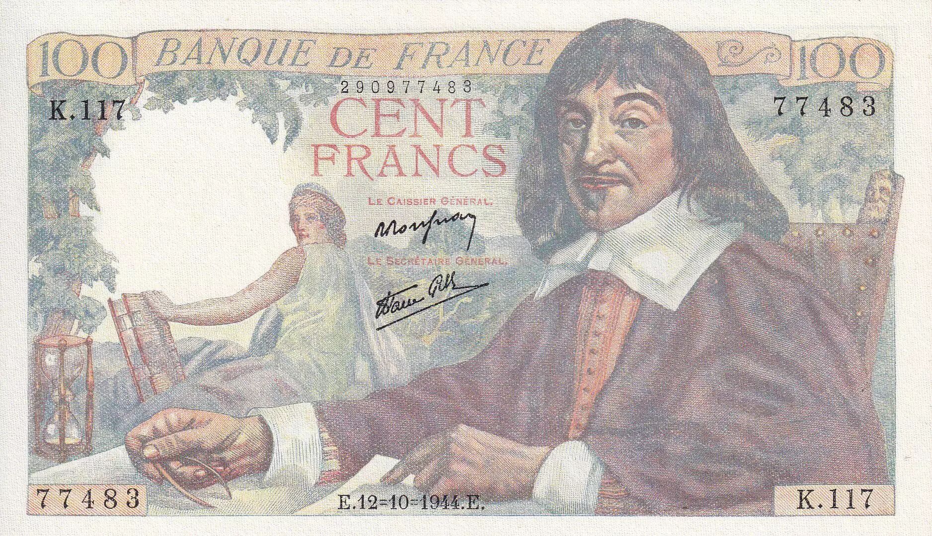 Banknote France 100 Francs - Descartes - 12-10-1944 - Serial K.117 - P.101