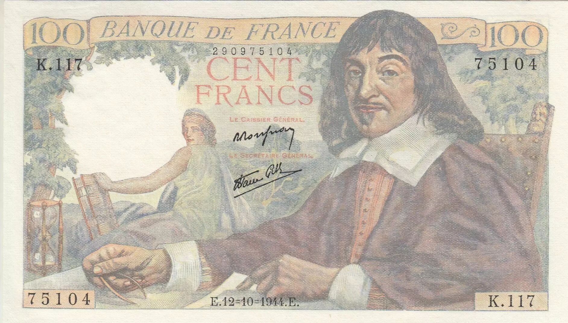 Ce billet de banque français d'une valeur nominale de 100 francs, émis le 12 octobre 1944, fait partie de la série K.117. Il représente une figure historique importante : René Descartes.
