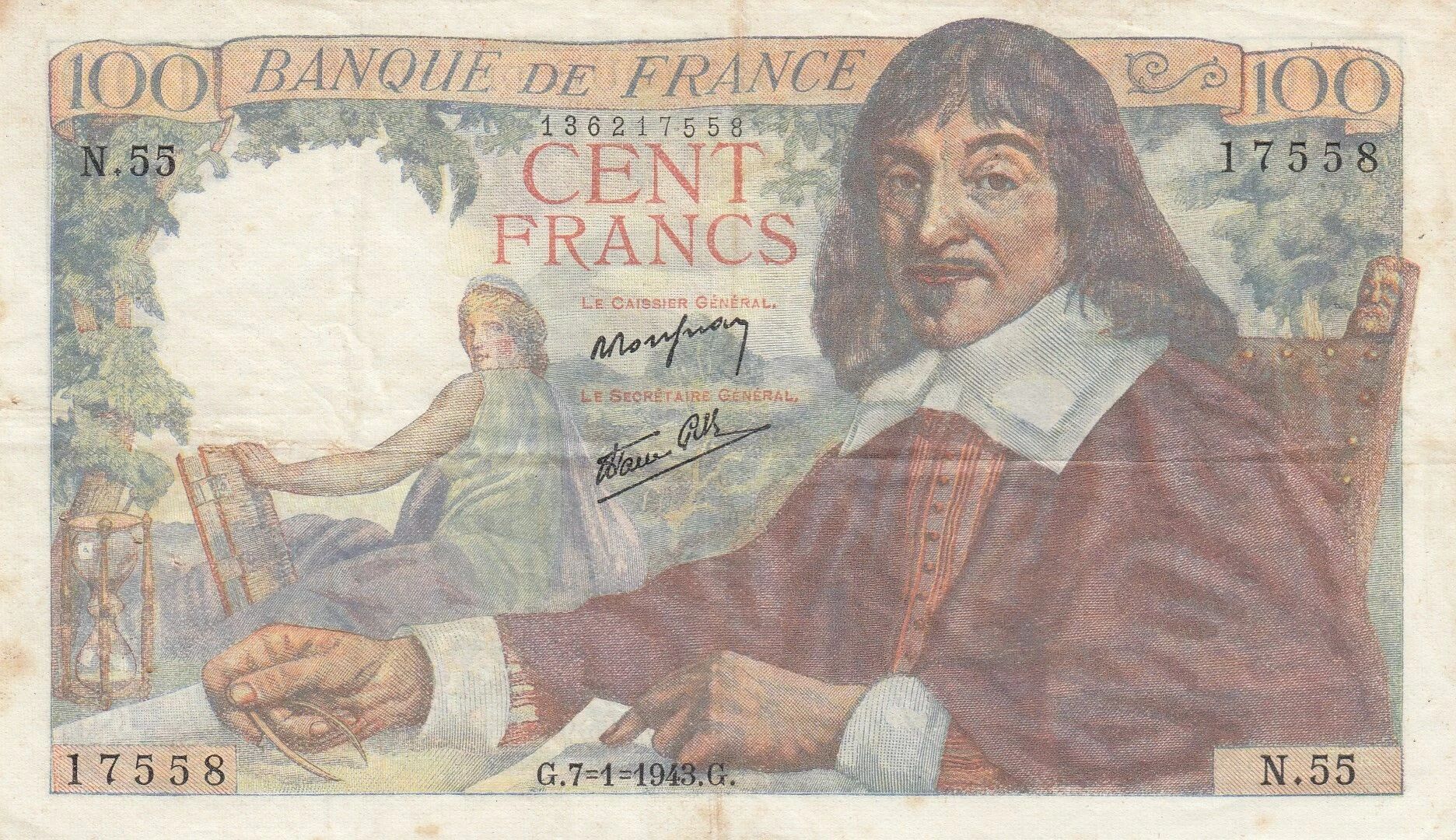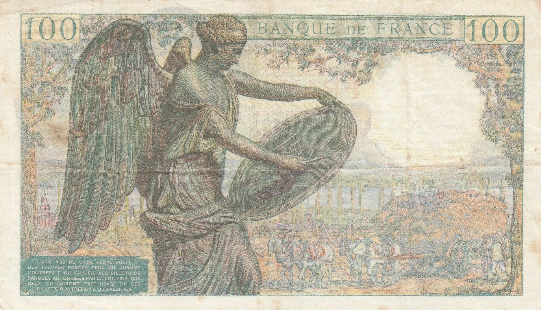 This French banknote has a face value of 100 francs. It was issued in 1943.