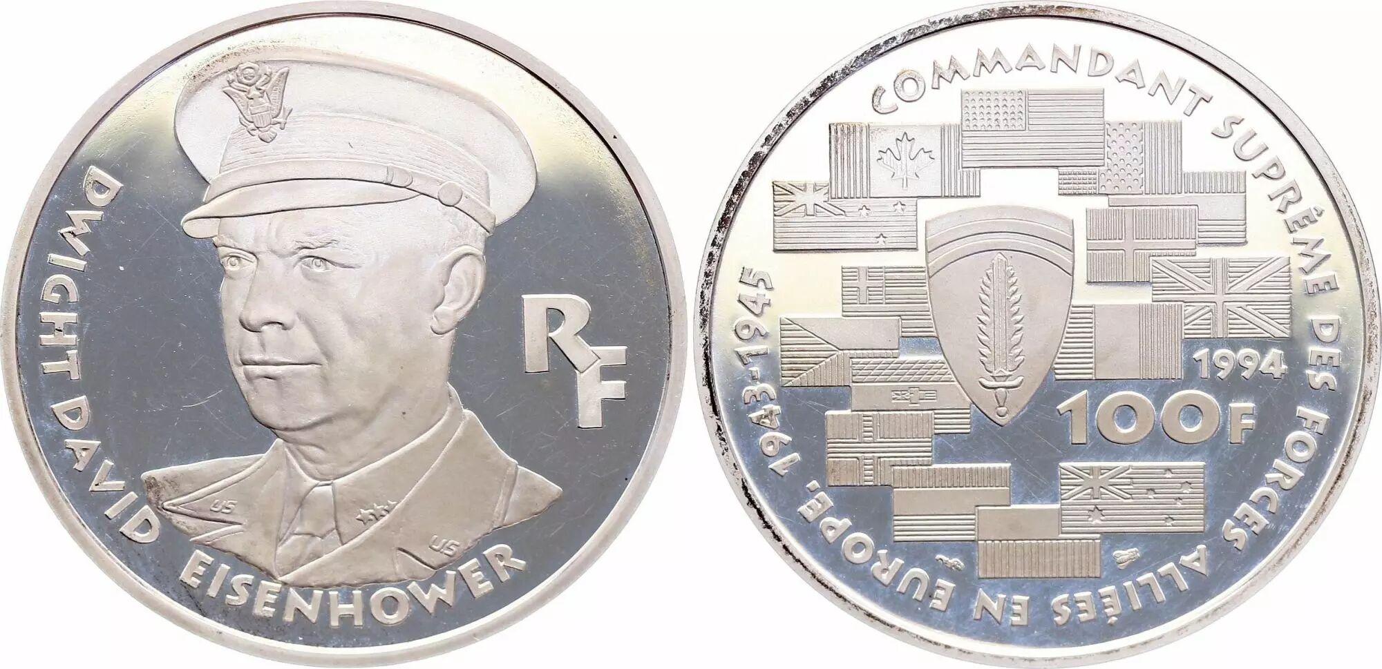 Pièce France 100 Francs, Eisenhower - 50e anniversaire du débarquement et de la libération? -1994 - Frappe BE - Argent