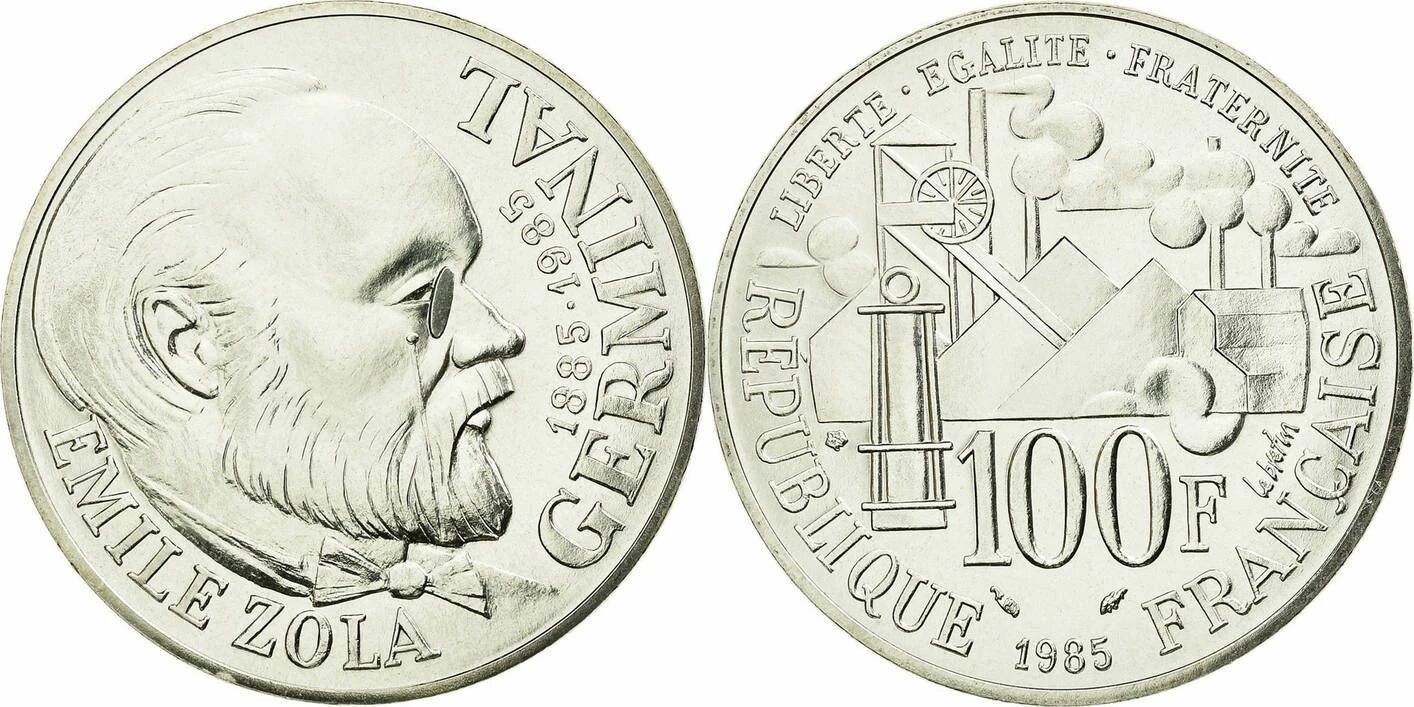 Cette pièce commémorative française de 100 francs, frappée en argent, rend hommage à Émile Zola et à son ?uvre "Germinal". Émise en 1985, elle est composée d'argent avec un titrage de 900 millièmes.