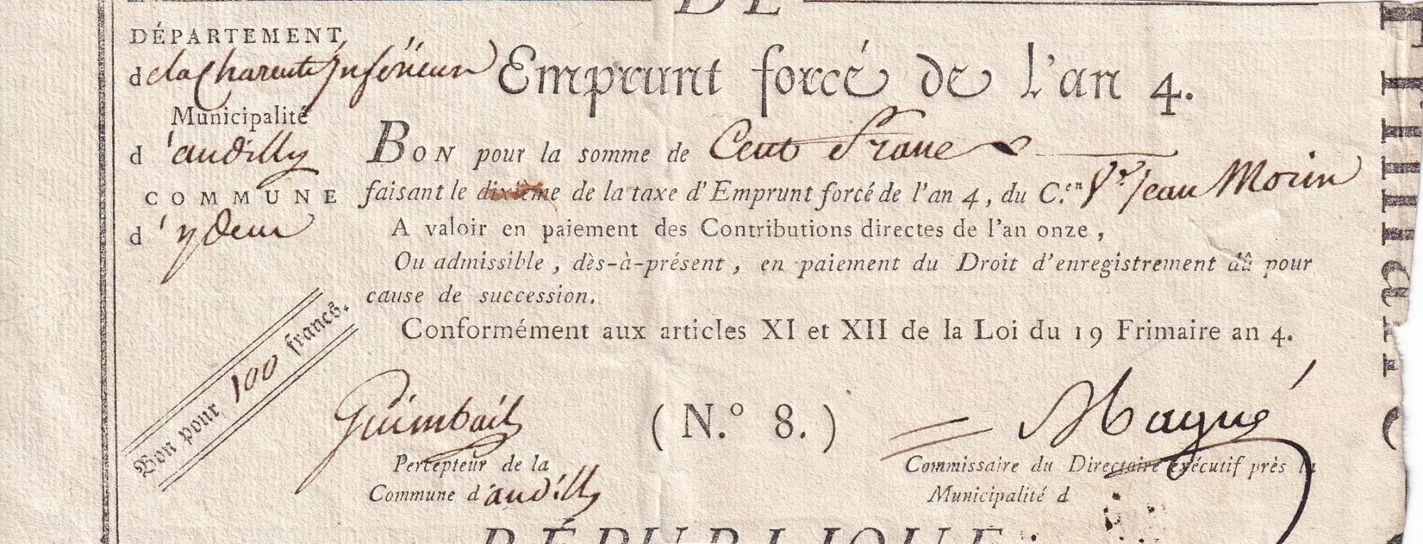 Home > > France 100 Francs - Emprunt Forcé - Year 4 (1796) - Charente-Inférieure - Audilly - XF