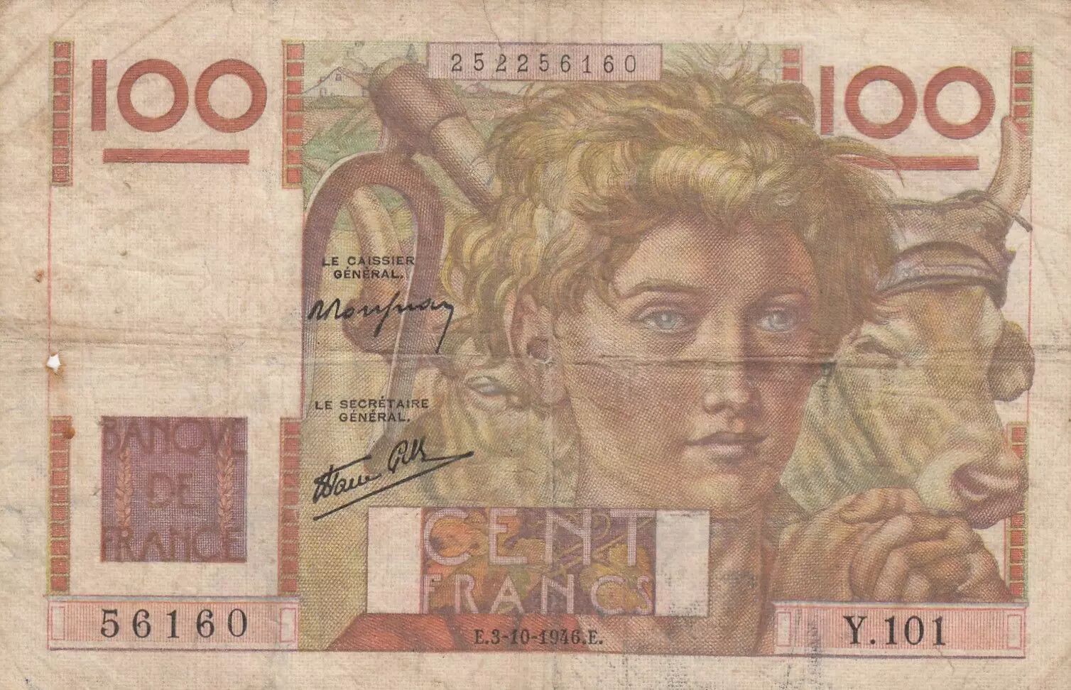 Banknote France 100 Francs - Farmer - 03-10-1946 - Serial Y.101