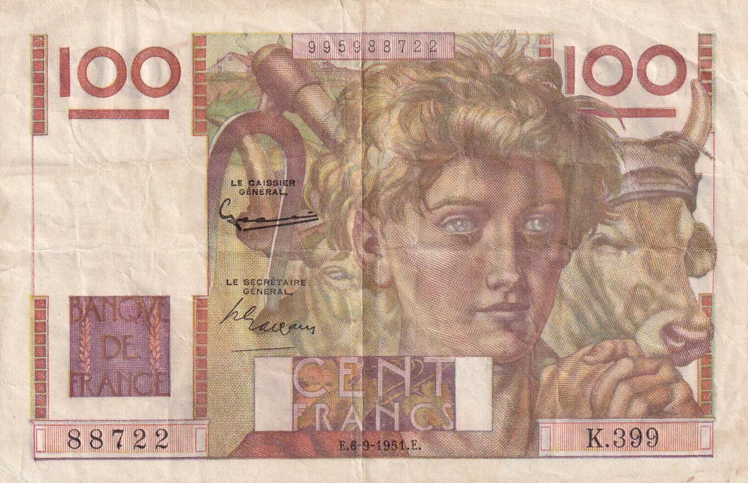Home > > France 100 Francs Farmer - 06-09-1951 - Serial K.399 - VF