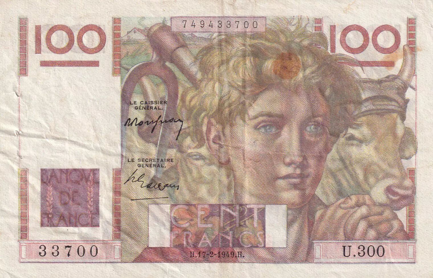 Home > > France 100 Francs Farmer - 17-02-1949- Serial U.300 - VF