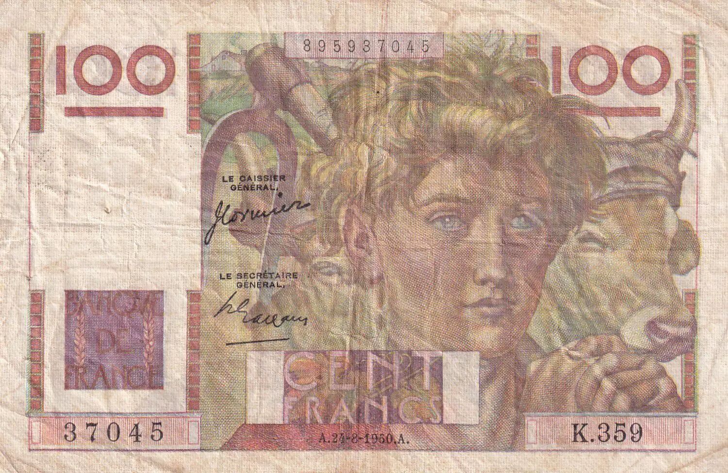 Home > > France 100 Francs Farmer - 24-08-1950 - Serial K.359 - VF