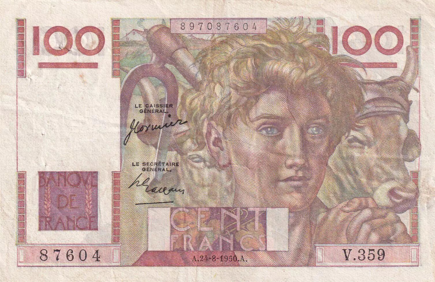 Home > > France 100 Francs Farmer - 24-08-1950 - Serial V.359 - VF