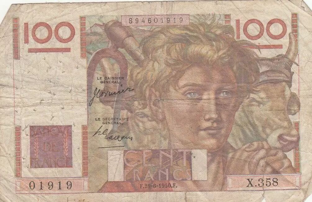 Banknote France 100 Francs Farmer - 29-06-1950 - Serial X.358