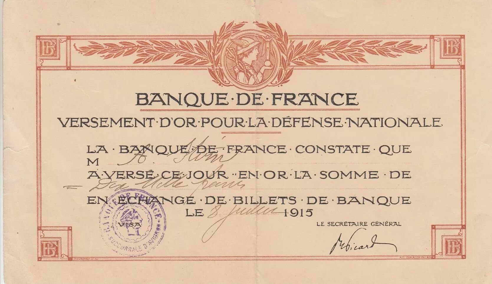 Home > > France 100 francs - Gold Payment Receipt for National Defence - 1915