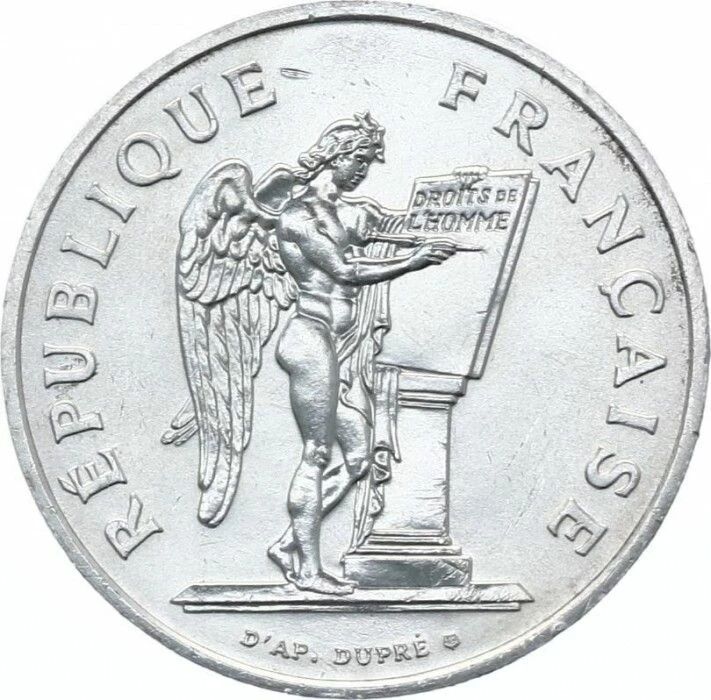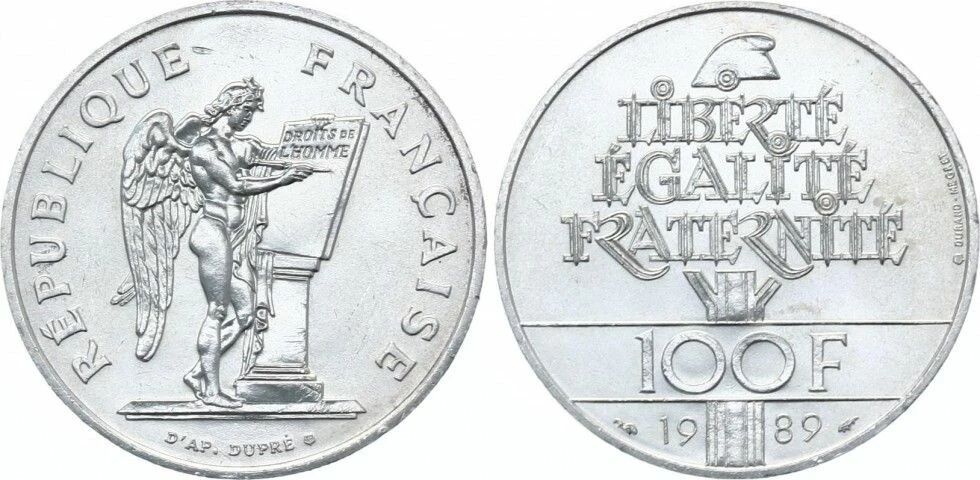 The 100 Francs ?Rights of Man? coin issued in 1989 is part of the series of major French commemorative silver coins of the Fifth Republic. It celebrates the bicentennial of the Declaration of the Rights of Man and of the Citizen (1789?1989), a fundamental text of the French Revolution and a pillar of modern republican values.