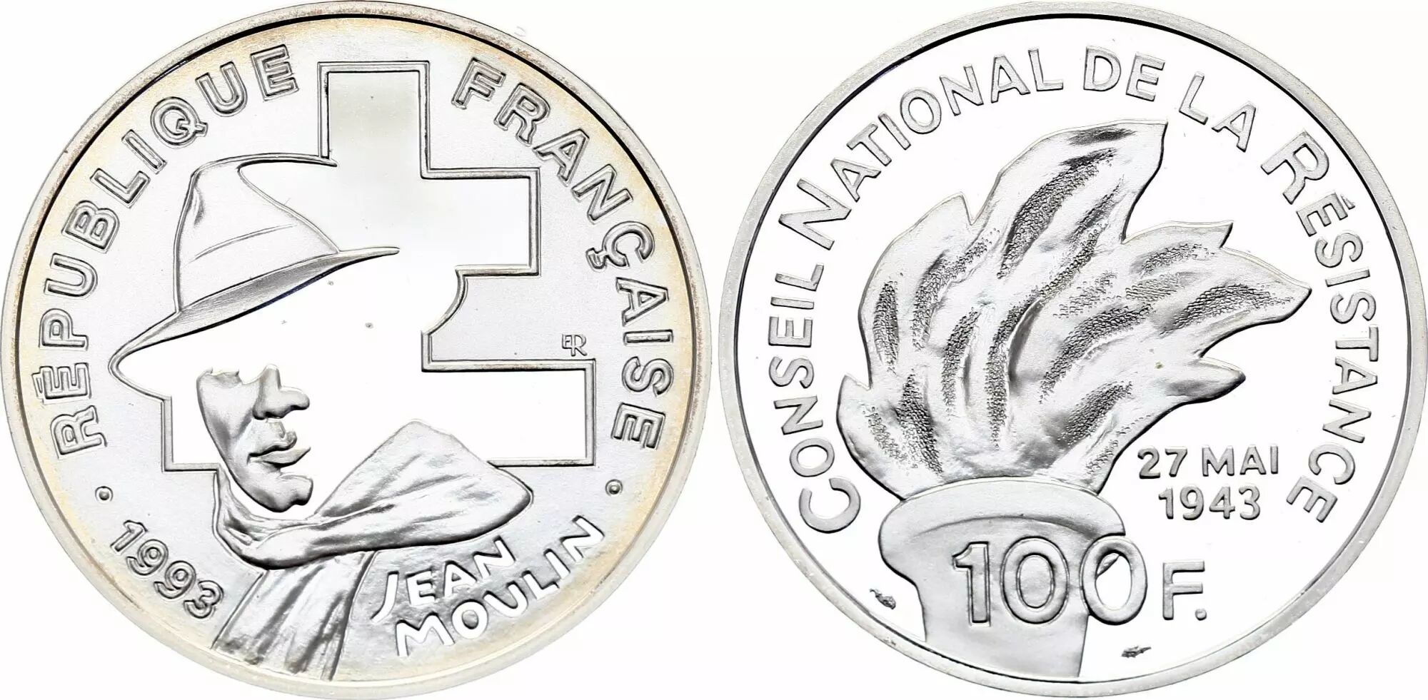 The reverse of the coin depicts a torch, a symbol of the flame of the Resistance. The inscription "CONSEIL NATIONAL DE LA RÉSISTANCE 27 MAI 1943" recalls the date of the creation of this unifying body of the French internal Resistance. The face value "100 F." is indicated at the bottom of the coin.