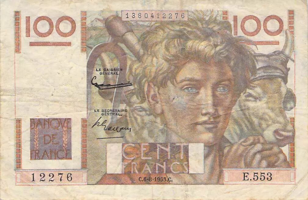 Accueil > Archivage > archivage-Archivage > France 100 Francs Jeune Paysan - 06-08-1953 - Série E.553 - Filigrane inversé - TB