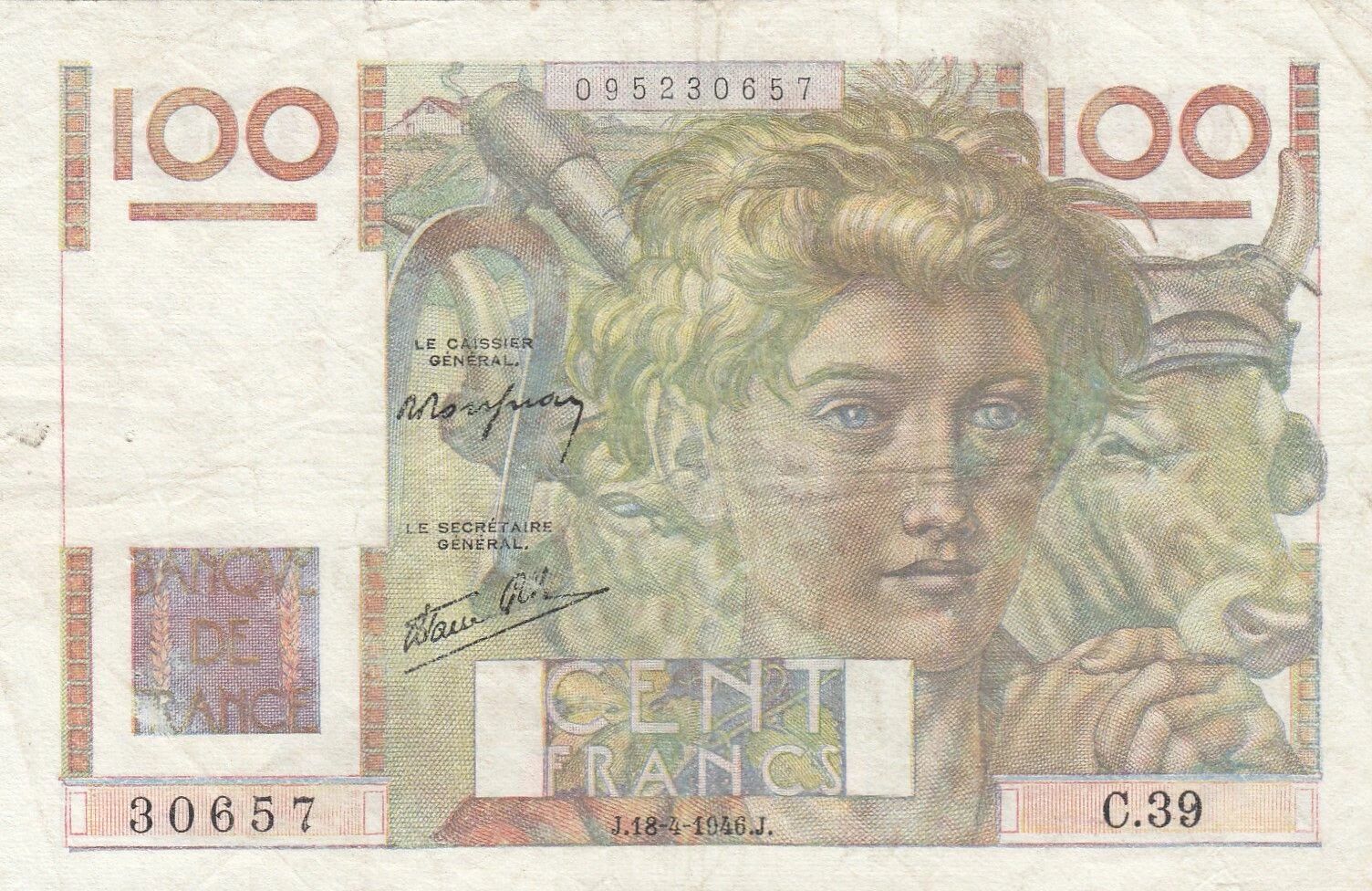 Ce billet de banque français a été émis le 18 avril 1946. Il appartient à la série C.39 et a une valeur nominale de 100 francs.