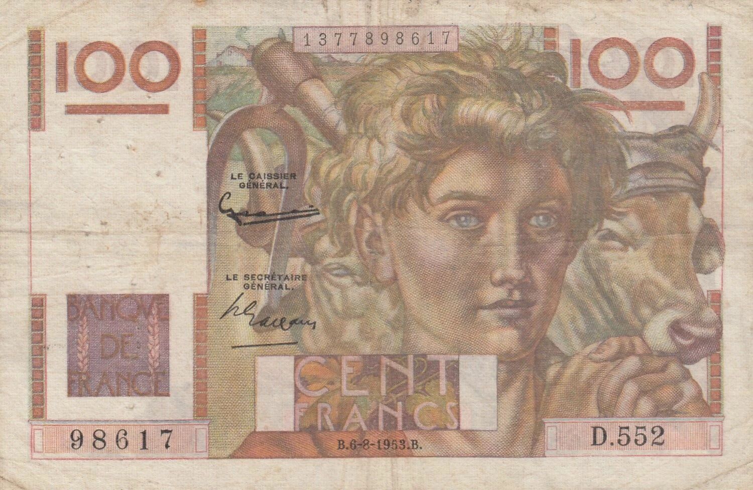 Ce billet de banque français a une valeur nominale de 100 francs. Il a été émis en 1953.