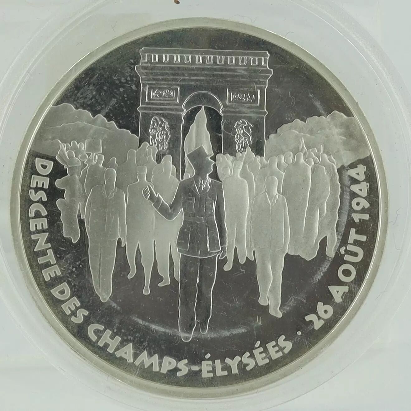 The obverse of the coin features a representation of General de Gaulle walking down the Champs-Élysées, a strong symbol of the Liberation of Paris. This scene is framed by the republican motto "LIBERTÉ * ÉGALITÉ * FRATERNITÉ". The legend "République française" completes the obverse. The engraving of this face is attributed to the Atelier de Gravure (A.G.M.M.).