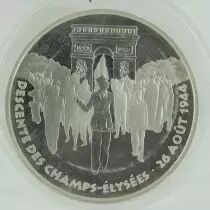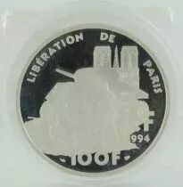 This French 100 Francs commemorative coin, minted in 1994, pays tribute to the 50th anniversary of the Liberation of Paris. It is made of 900? silver, with a weight of 22.2 grams and a diameter of 37 millimeters, and a thickness of 2.2 millimeters. Its mintage is limited to 30,000 copies. This coin is sold without its original packaging or certificate of authenticity.