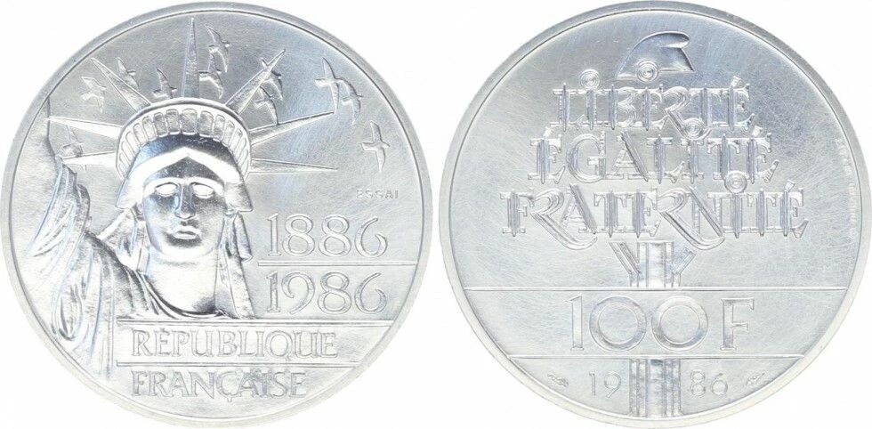 This 100 Francs coin commemorates the centenary of the Statue of Liberty (1886-1986). It was issued in 1986 by France. The coin is made of silver, weighs 15 grams and has a diameter of 31 millimeters.