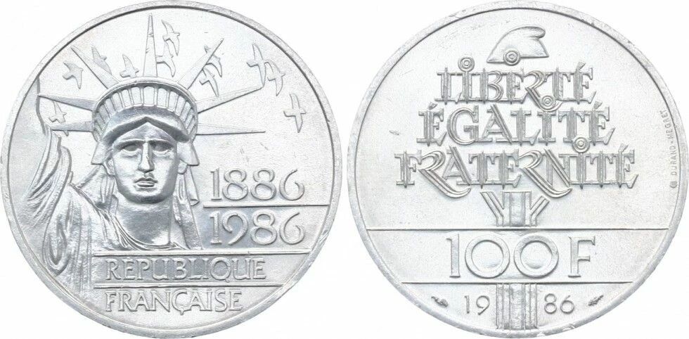 The 100 Francs ?Liberté? coin issued in 1986 is part of the series of major French commemorative silver coins of the Fifth Republic. It celebrates the centenary of the Statue of Liberty (1886?1986), a universal symbol of freedom offered by France to the United States, marking the friendship between the two nations.