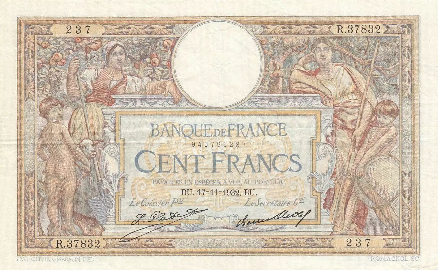 Accueil > Billets Français > Billets Banque de France > Billets 100 Francs > Luc Oliver Merson type 1906 (1908-1939) > France 100 Francs LOM - Grands cartouches - 17-11-1932 - Série R.37832