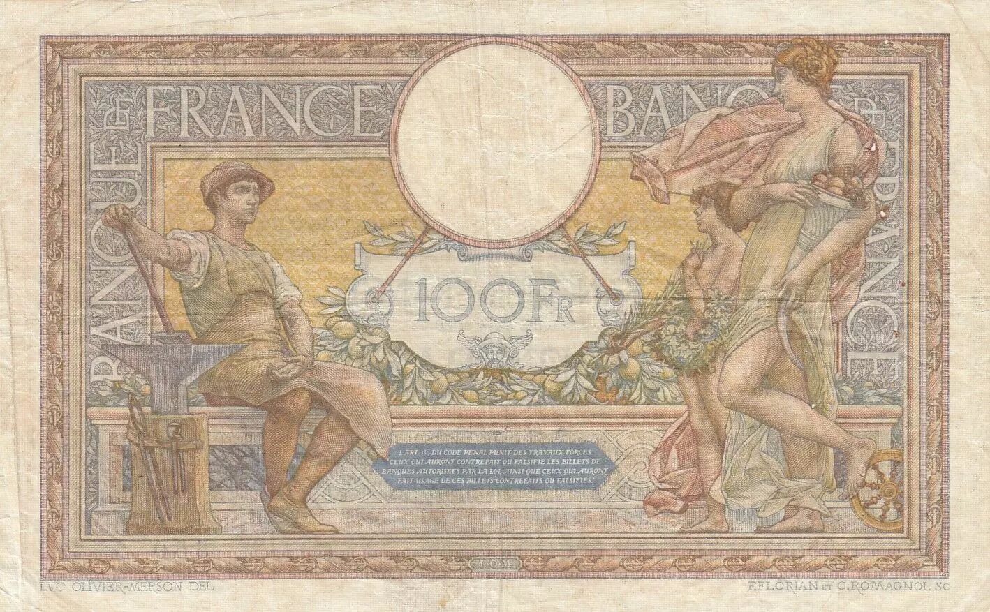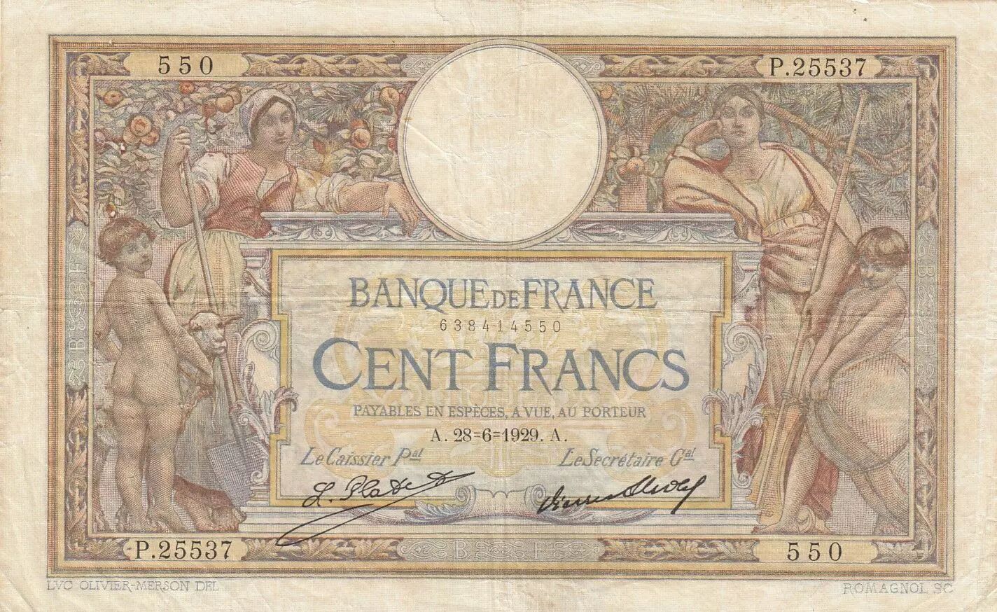 Accueil > Billets Français > Billets Banque de France > Billets 100 Francs > Luc Oliver Merson type 1906 (1908-1939) > France 100 Francs LOM - Grands cartouches - 28-06-1929 - Série P.25537