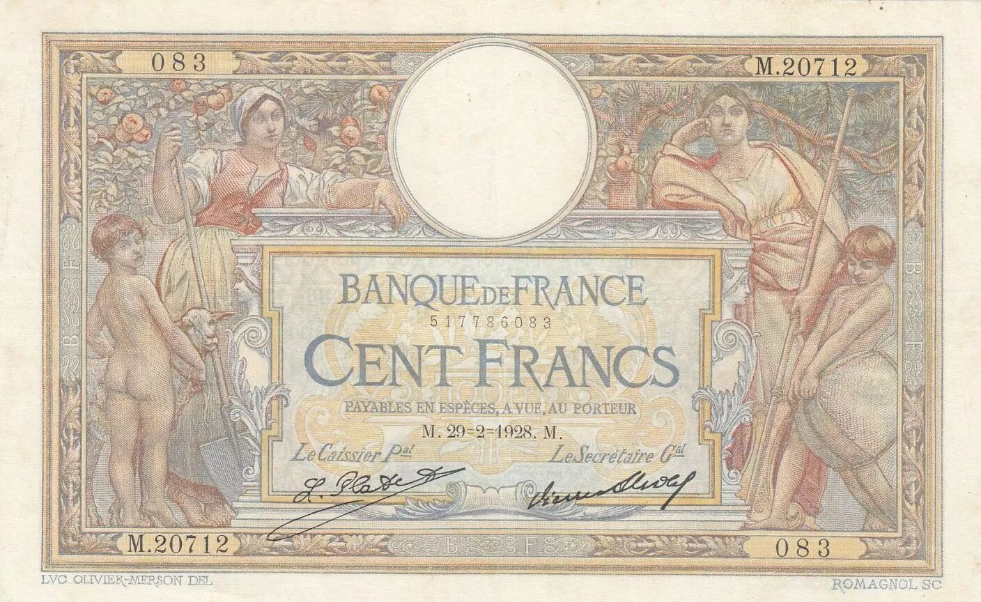 Accueil > Billets Français > Billets Banque de France > Billets 100 Francs > Luc Oliver Merson type 1906 (1908-1939) > France 100 Francs LOM - Grands cartouches - 29-02-1928 - Série M.20712
