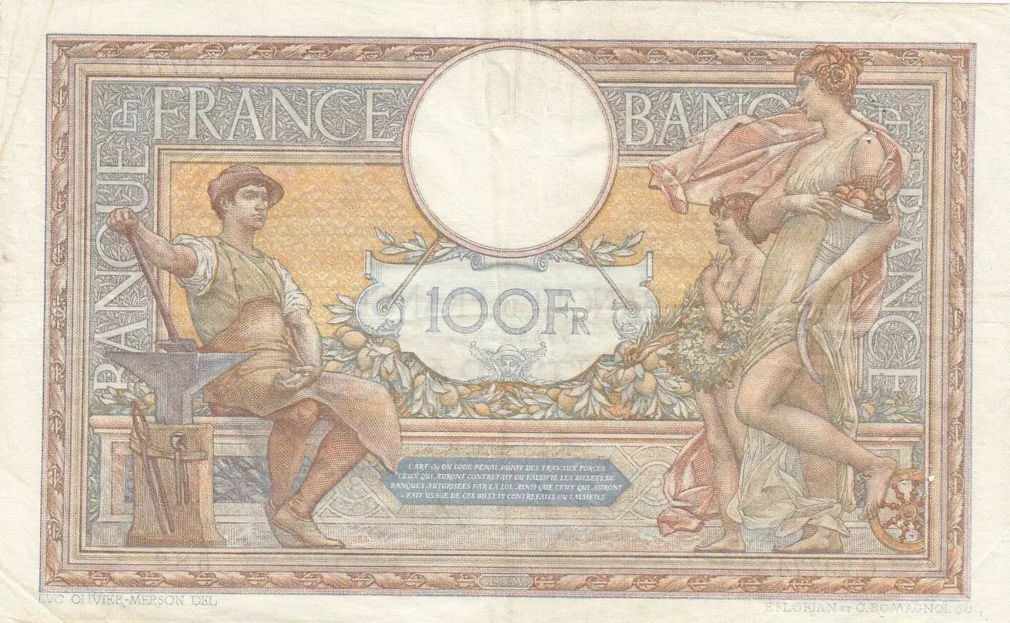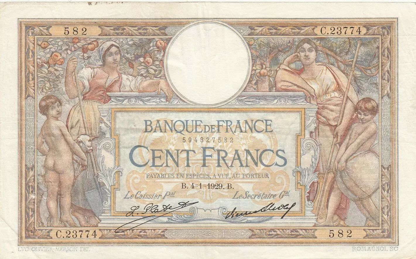 Home > French Banknotes > Bank of France Banknotes > 100 Francs Banknotes > Luc Olivier Merson Type 1906 (1908-1939) > France 100 Francs LOM - large cartridges - 04-01-1929 - Serial C.23774