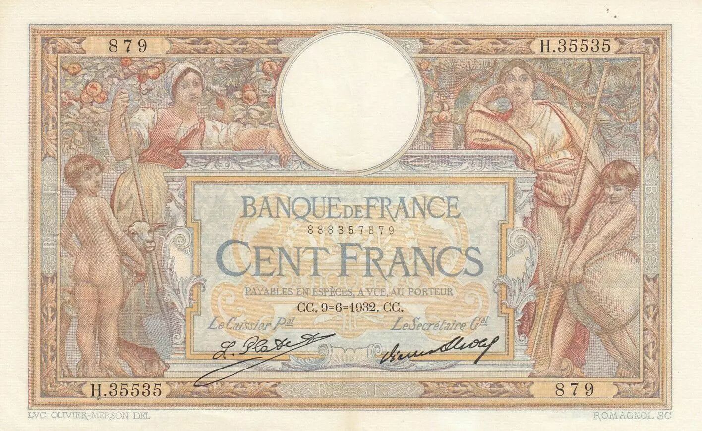 Banknote France 100 Francs LOM - large cartridges - 09-06-1932 - Serial H.35535