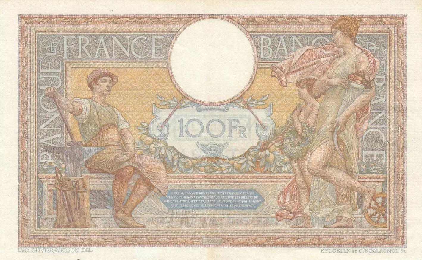 Home > French Banknotes > Bank of France Banknotes > 100 Francs Banknotes > Luc Olivier Merson Type 1906 (1908-1939) > France 100 Francs LOM - large cartridges - 09-06-1932 - Serial H.35535