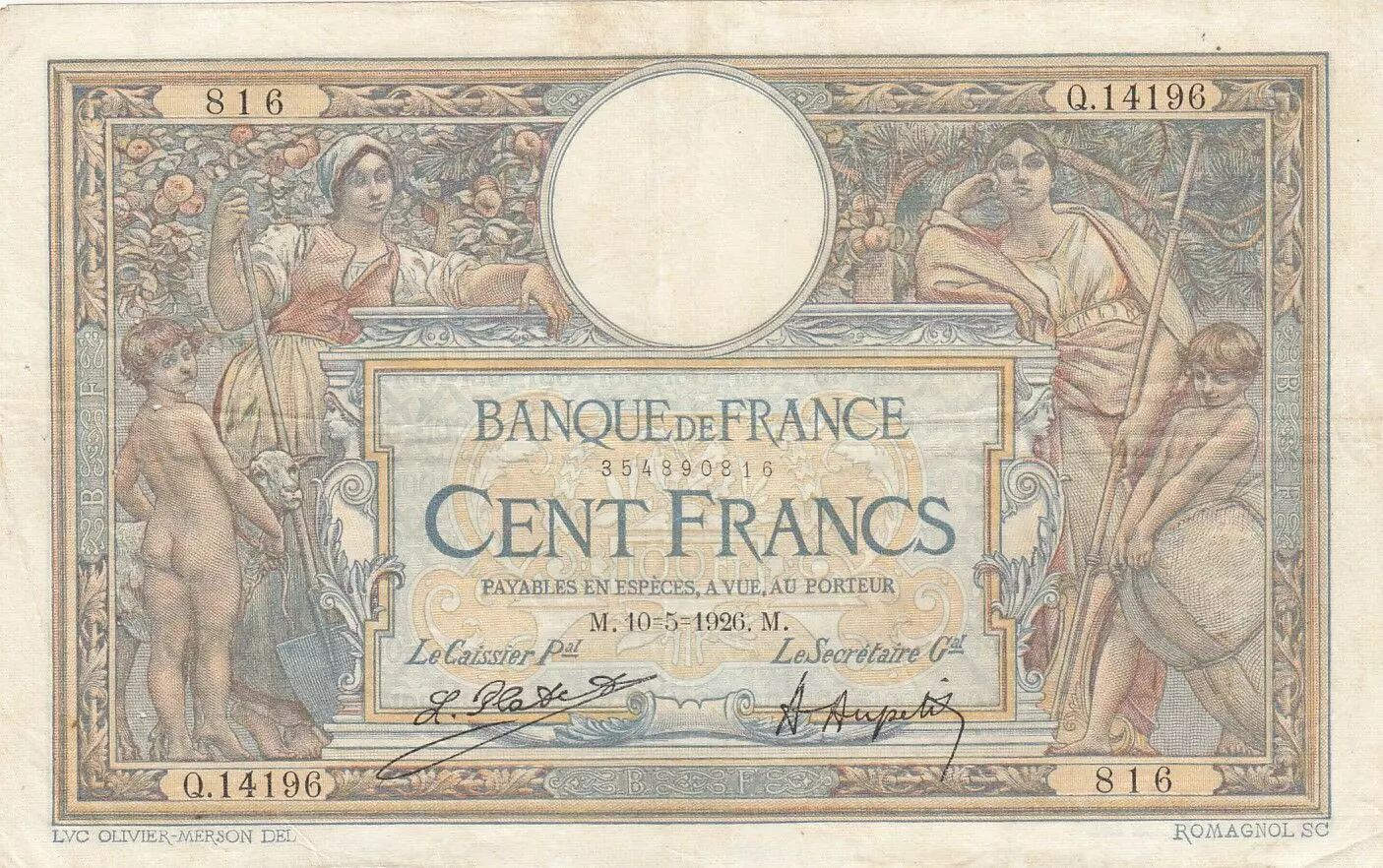 Home > > France 100 Francs LOM - large cartridges - 10-05-1926 - Serial Q.14196