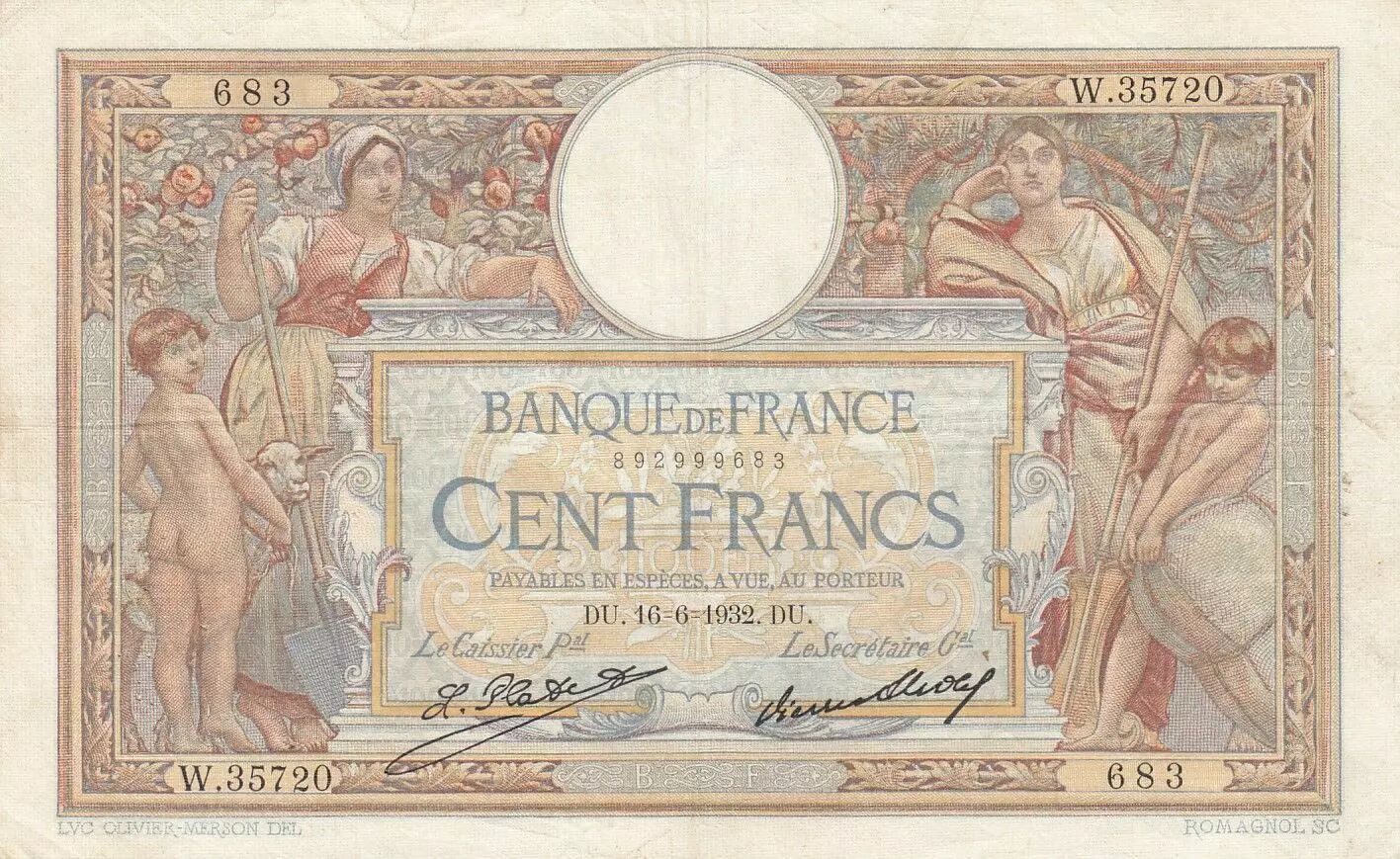 Home > French Banknotes > Bank of France Banknotes > 100 Francs Banknotes > Luc Olivier Merson Type 1906 (1908-1939) > France 100 Francs LOM - large cartridges - 16-06-1932 - Serial W.35720