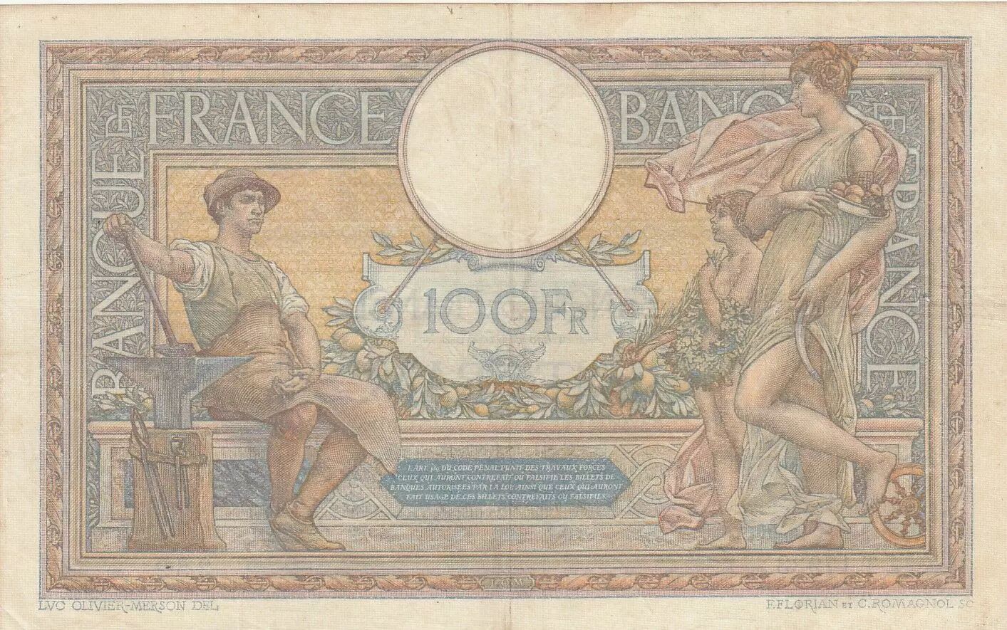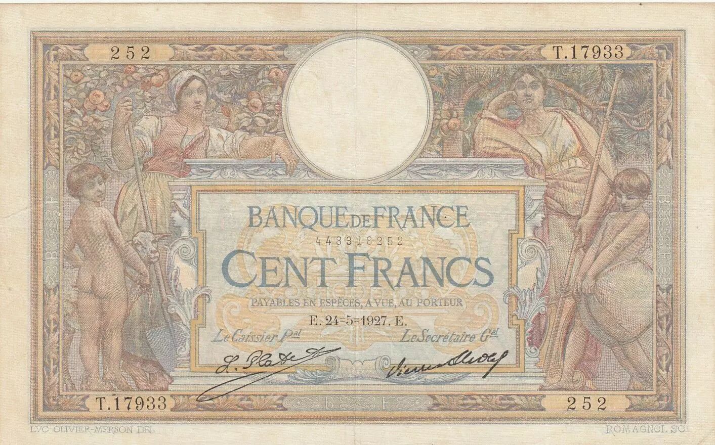 Banknote France 100 Francs LOM - large cartridges - 24-05-1927 - Serial T.17933