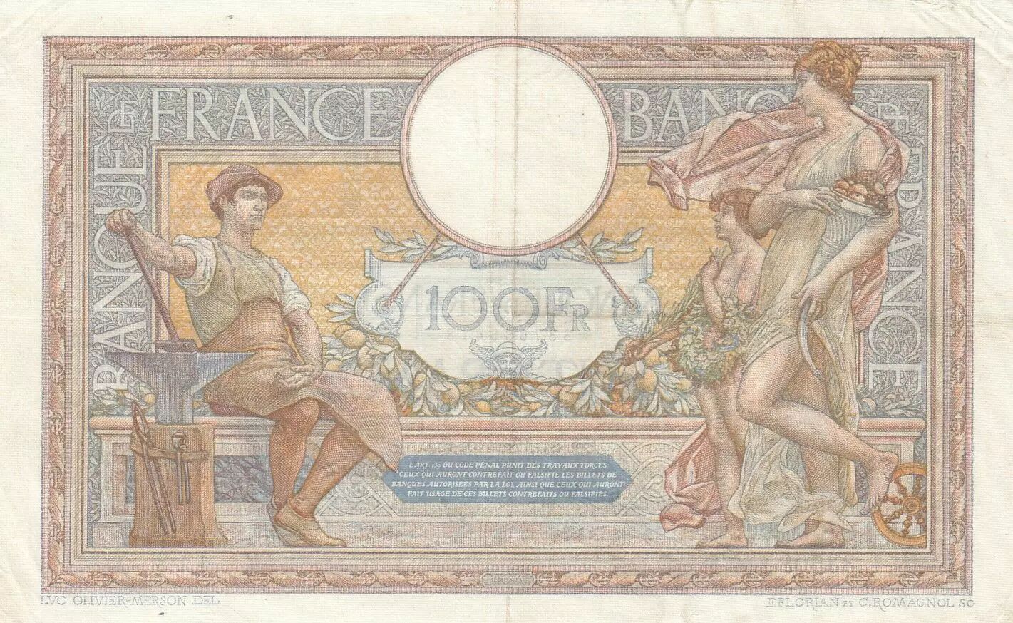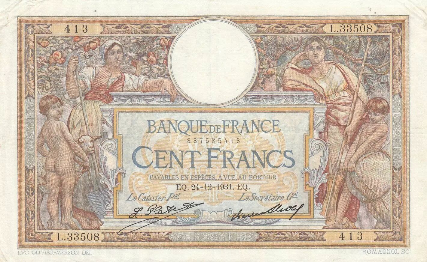 Home > French Banknotes > Bank of France Banknotes > 100 Francs Banknotes > Luc Olivier Merson Type 1906 (1908-1939) > France 100 Francs LOM - large cartridges - 24-12-1931 - Serial L.33508