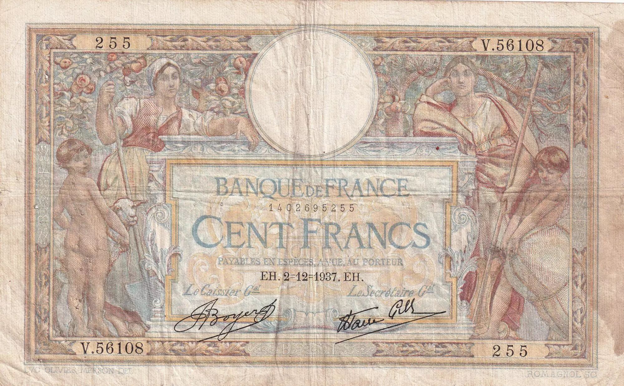 Banknote France 100 Francs Luc Olivier Merson - 02-12-1937 - Serial V.56108