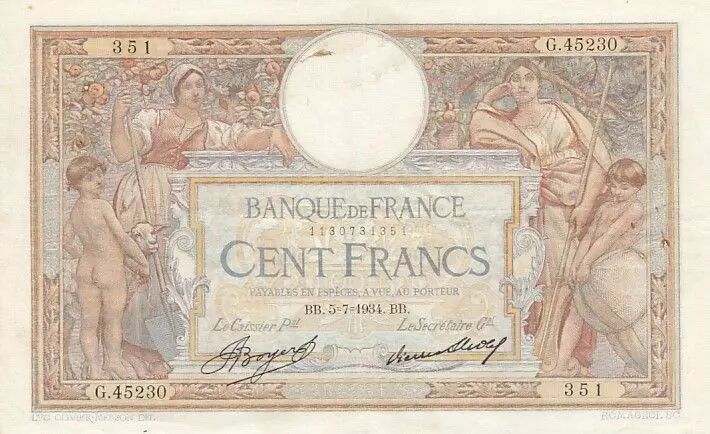 Banknote France 100 Francs Luc Olivier Merson - 05-07-1934 - Serial G.45230