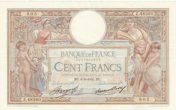 Banknote France 100 Francs Luc Olivier Merson - 06-06-1935 - Serial Z.48560