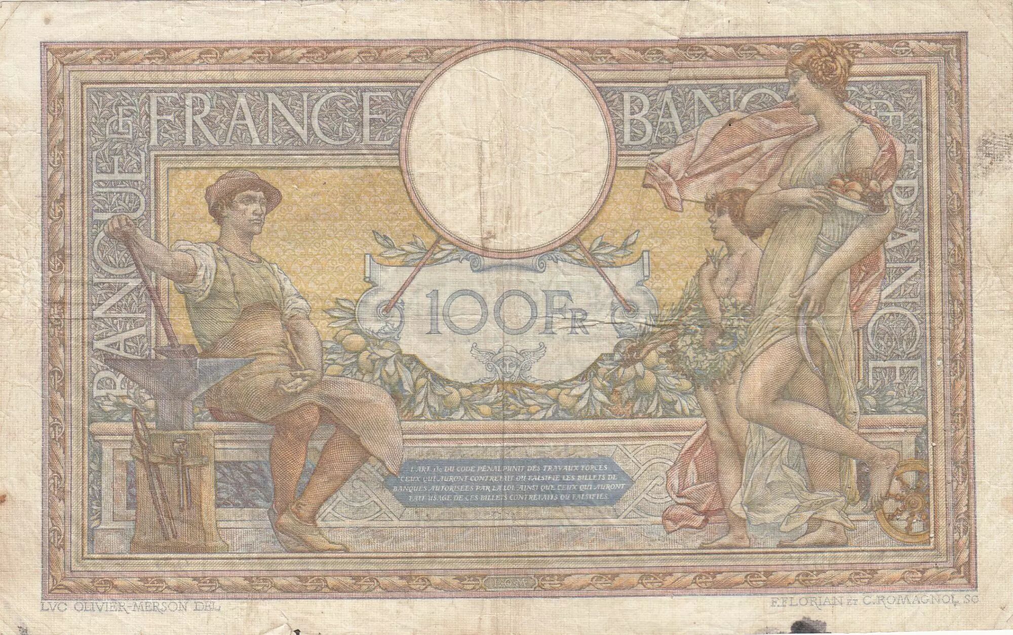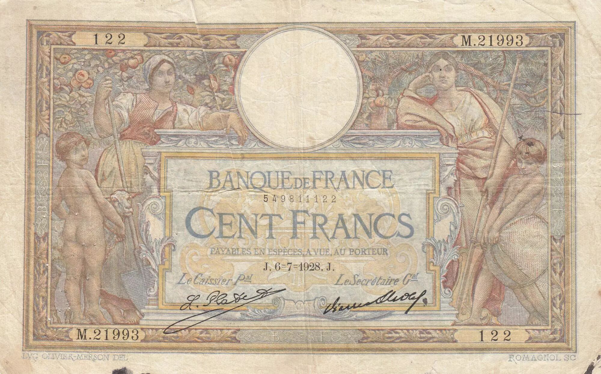 Accueil > Archivage > archivage-Billets Français > France 100 Francs - Luc Olivier Merson - 06-07-1928 - Série M.21993