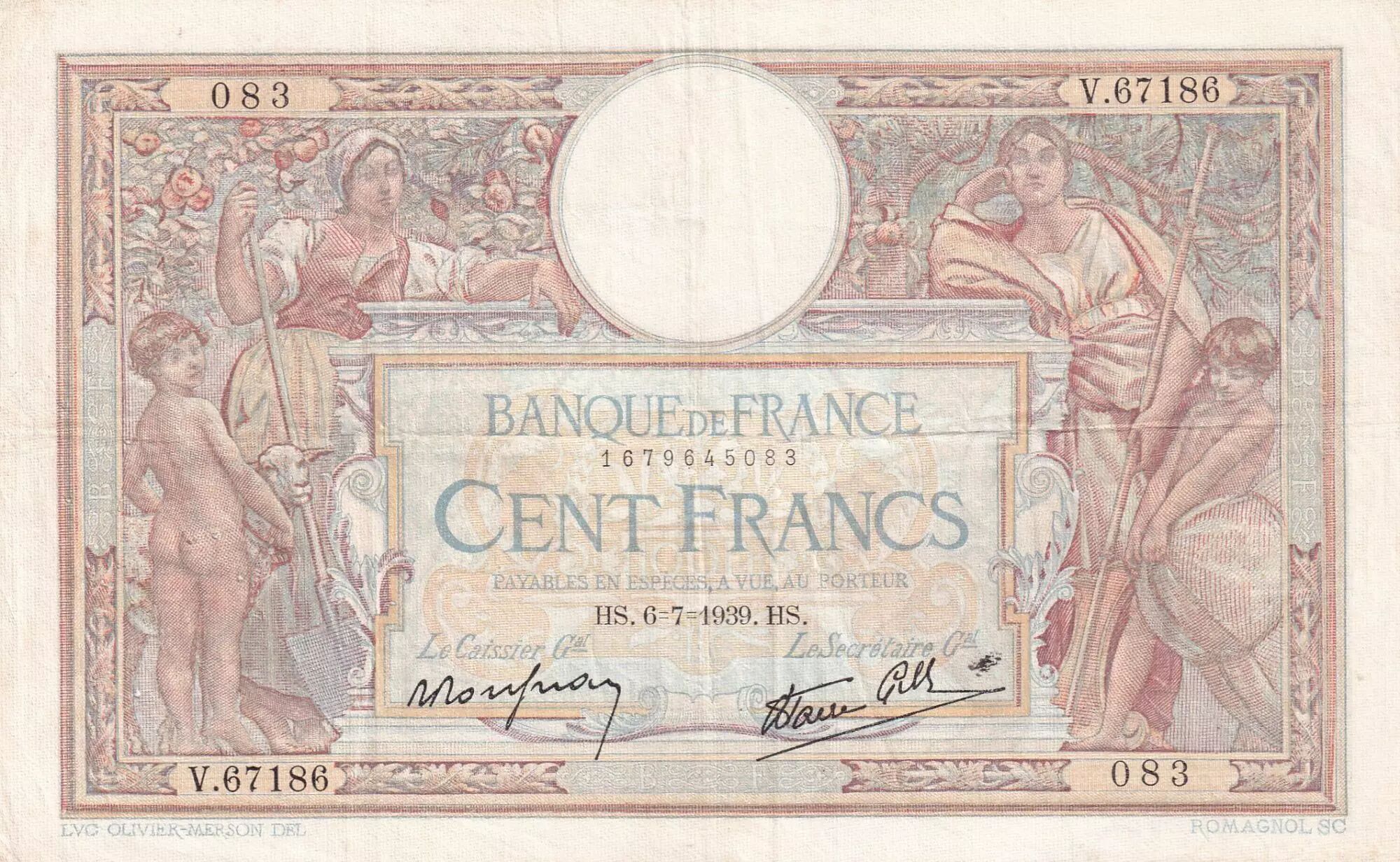 Billet France 100 Francs - Luc Olivier Merson - 06-07-1939 - Série V.67186