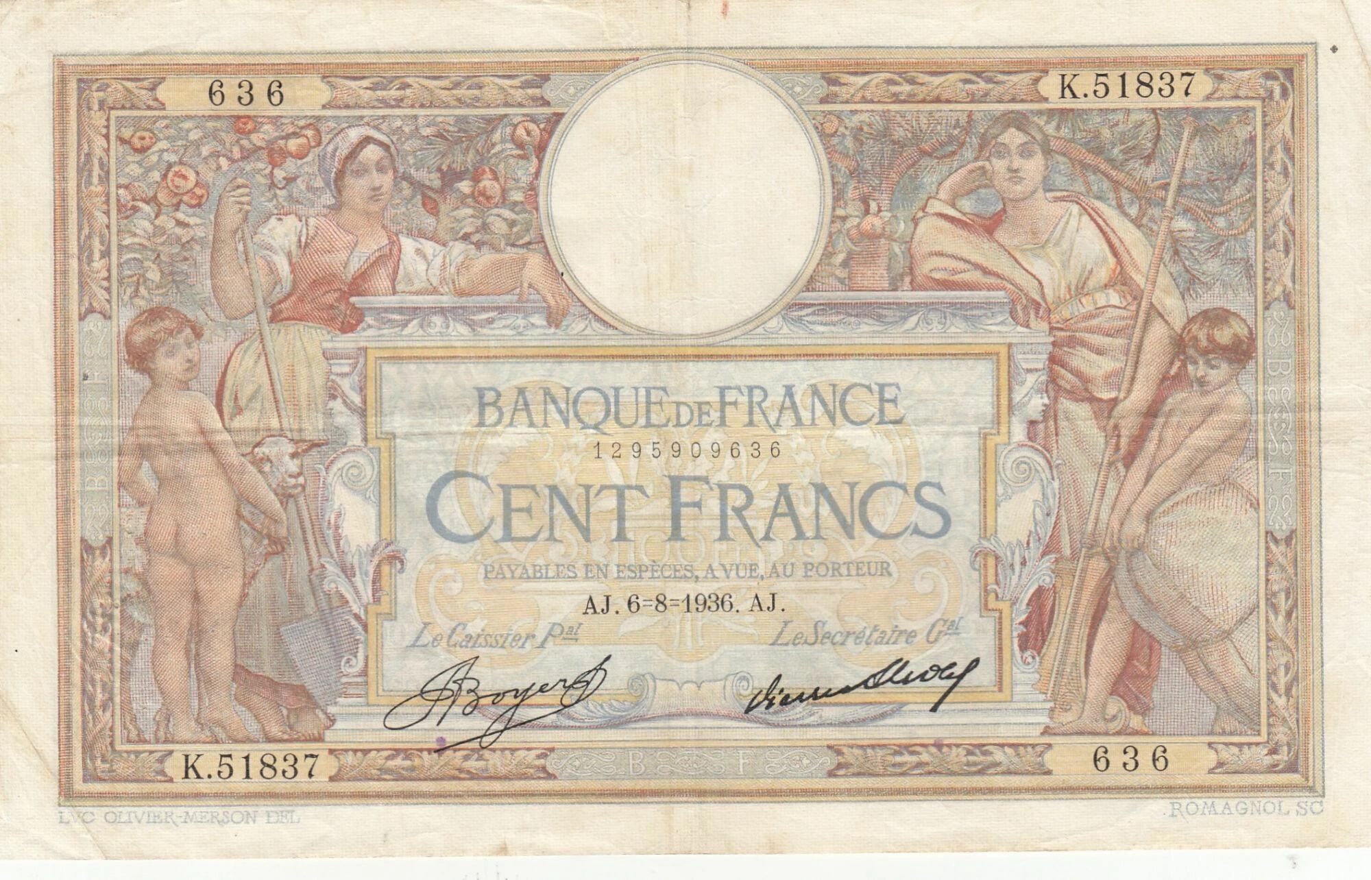 This banknote is an issue from France, with a face value of 100 francs. It was issued on August 6, 1936.