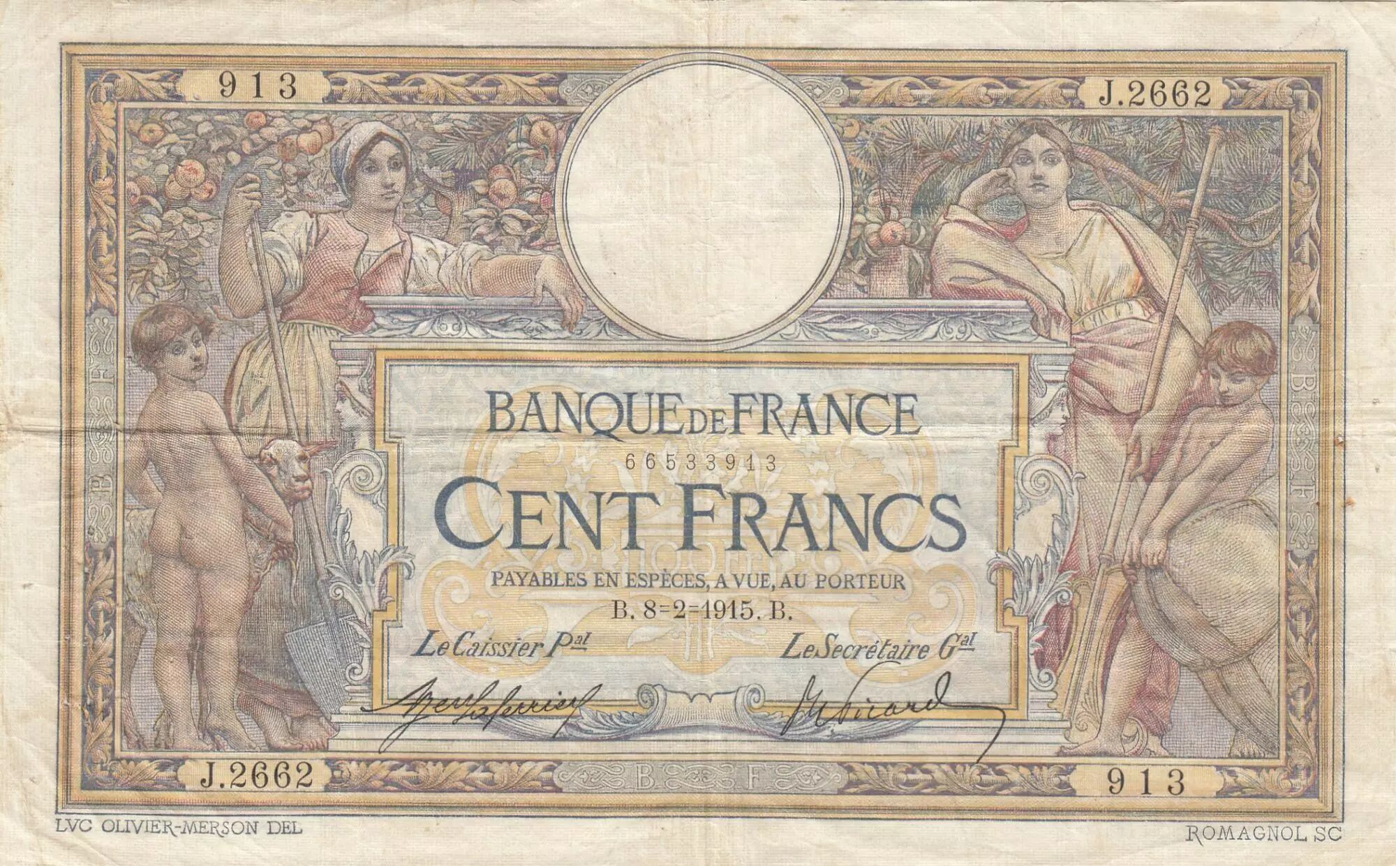 Ce billet de banque français a une valeur nominale de 100 francs. Il appartient à la série dite "Luc Olivier Merson".