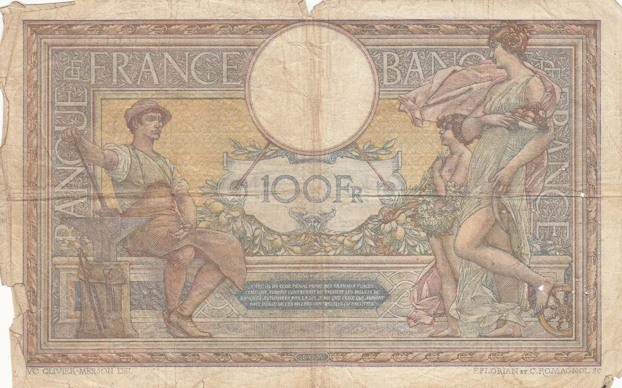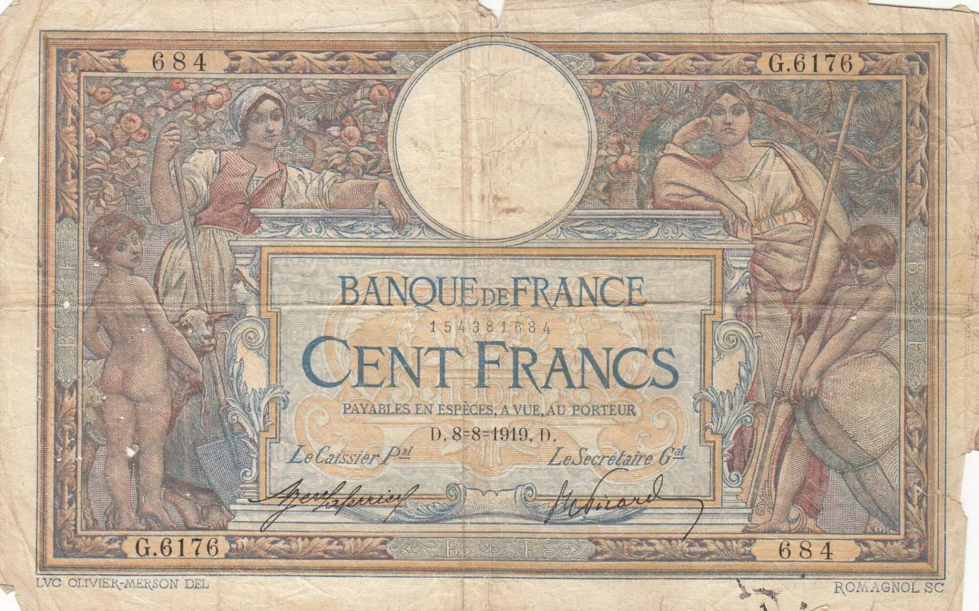Home > > France 100 Francs - Luc Olivier Merson - 08-08-1919 - Serial G.6176