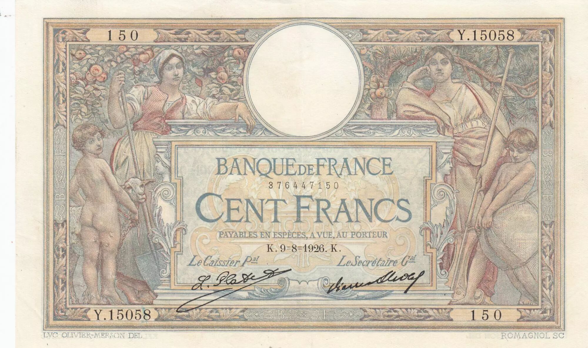 Banknote France 100 Francs - Luc Olivier Merson - 09-08-1926 - Serial Y.15058