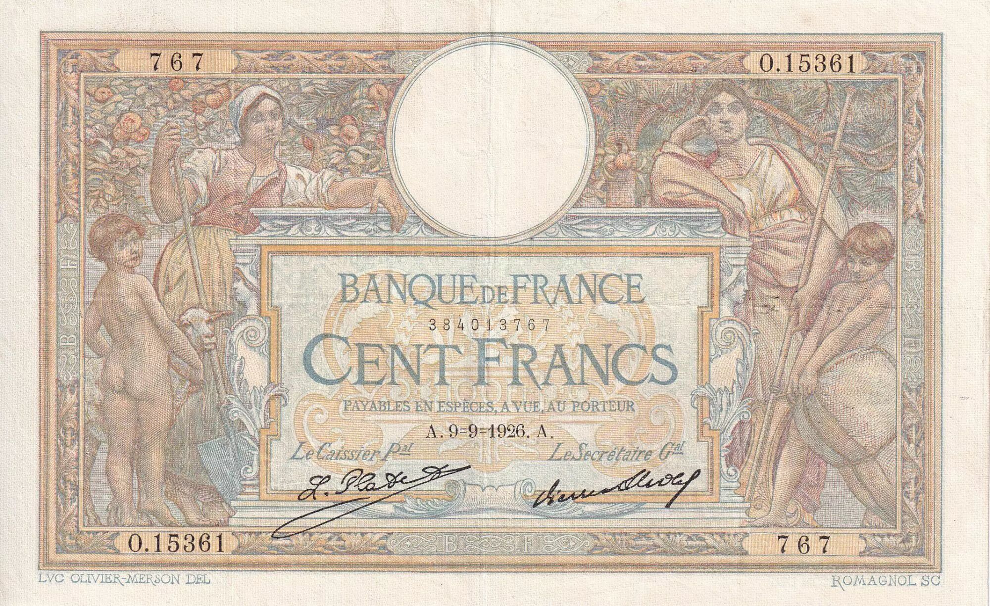 Accueil > Billets Français > Billets Banque de France > Billets 100 Francs > Luc Oliver Merson type 1906 (1908-1939) > France 100 Francs - Luc Olivier Merson - 09-09-1926 - Série O.15361 - F.24.05