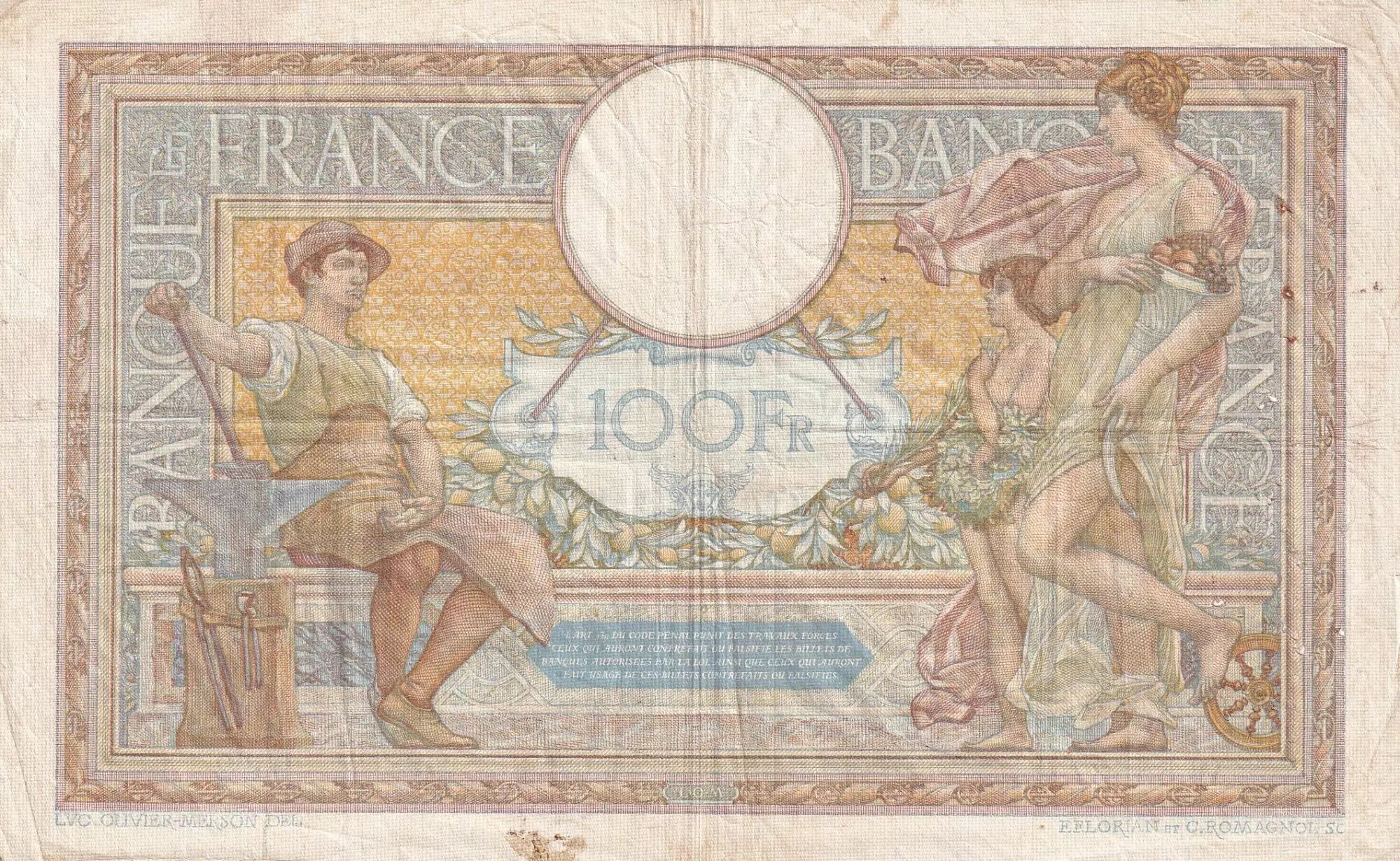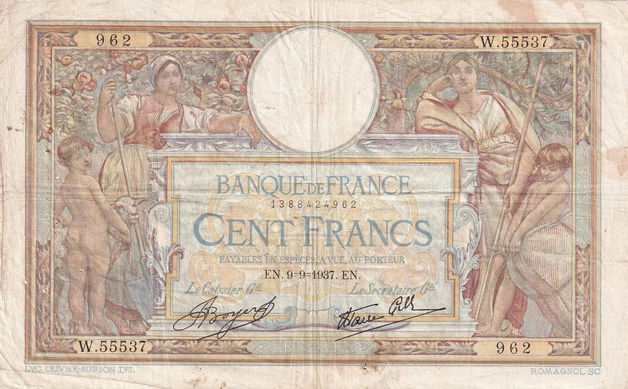 Banknote France 100 Francs Luc Olivier Merson - 09-09-1937 - Serial W.55537