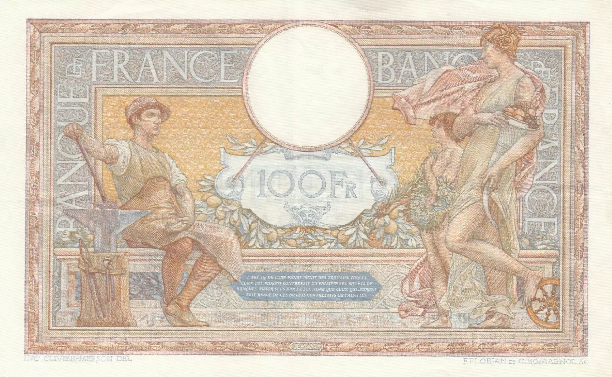 Le verso du billet met en scène des personnifications du Travail, symbolisé par un forgeron à gauche, et de la Fortune, représentée par une femme et un enfant tenant une corne d'abondance à droite. Des moulures dorées ornent également cette face. On y trouve les inscriptions "BANQUE DE FRANCE" répétées, la valeur "100 FR", ainsi qu'un rappel de l'article 139 du Code Pénal concernant la contrefaçon de billets de banque. Les noms des graveurs Frédéric Florian et Cesare Abramo Romagnoli, ainsi que celui du concepteur Luc Olivier Merson, sont mentionnés.